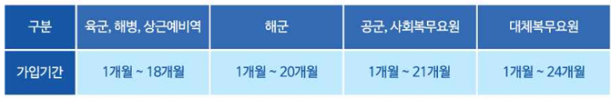 - 대상: 현역병, 상근예비역, 사회복부요원, 대체복무요원