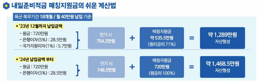- 만기 수령액: 육군 복무기간 18개월 / 월 40만원 납입 기준
